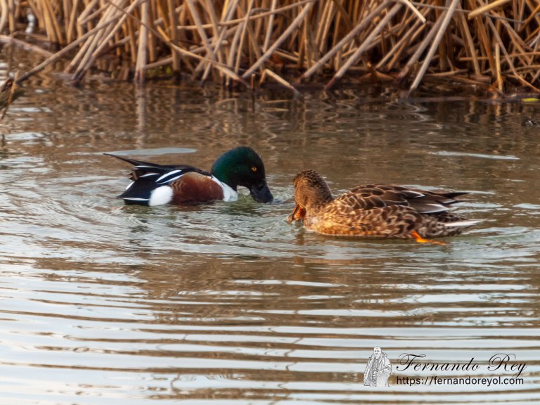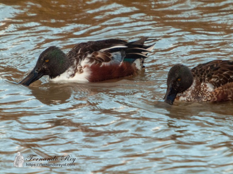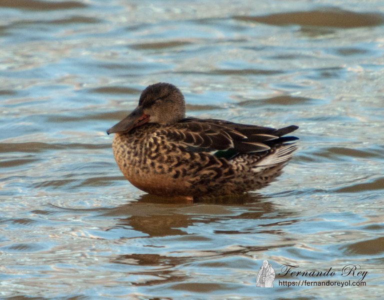 Las hembras tienen un plumaje pardo claro veteado como las hembras de sus congéneres, con un plumaje similar a la hembra del ánade real, pero fácilmente distinguible por su pico largo y ancho como los machos, pero que es grisáceo en la parte superior con las comisuras y la mandíbula inferior anaranjadas. las hembras tienen la parte frontal de las alas que en los machos es azul de color grisáceo. Los inmaduros se parecen a las hembras.