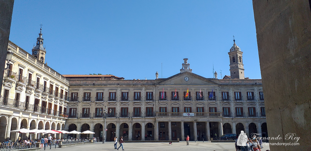 Plaza de España o Plaza Nueva. Es una gran plaza porticada concebida por el arquitecto Justo Antonio de Olaguibel en 1781 y concebida para unir el casco antiguo con el nuevo Ensanche (entonces en construcción), y para dotar a la ciudad de un espacio para celebrar festejos, corridas de toros y mercados populares. Uno de los elementos más importantes del conjunto es la Casa Consistorial, de decoración neoclásica. Se bautizó como Plaza Nueva en contraposición a la contigua Plaza de la Virgen Blanca antes denominada Plaza Vieja.